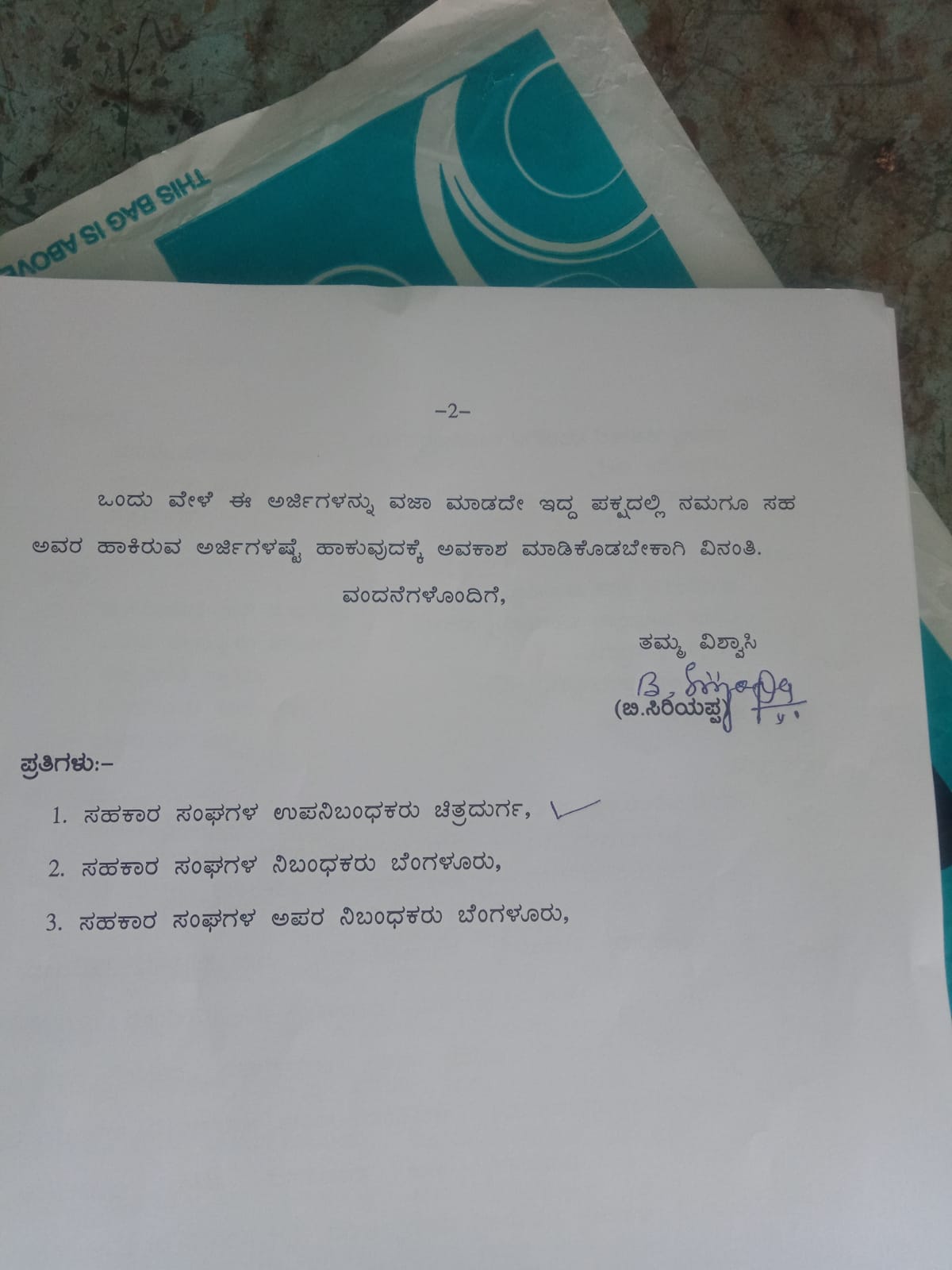ಇನ್ನೂ ಒಂದು ವೇಳೆ ಈ ಅರ್ಜಿಗಳನ್ನು ವಜಾ ಮಾಡದಿದ್ದರೇ, ನಮಗೂ ಸಹ ಅವರು ಹಾಕಿರುವ ಅರ್ಜಿಗಳಷ್ಟೇ ಹಾಕುವುದಕ್ಕೆ ಅವಕಾಶ ಮಾಡಿಕೊಡುವಂತೆ ಮಾಜಿ ತಾಲ್ಲೂಕು ಪಂಚಾಯ್ತಿ ಸದಸ್ಯ ಬಿ.ಸಿರಿಯಪ್ಪ ಅವರು ಸಹಕಾರ ಸಂಘಗಳ ಉಪನಿಬಂಧಕರನ್ನು ವಿನಂತಿಸಿದ್ದಾರೆ.