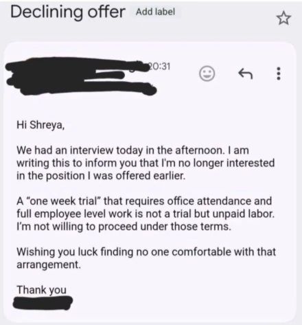 ನಿರಾಕರಿಸುತ್ತಿರುವ ಕೊಡುಗೆ ಎಂಬ ಶೀರ್ಷಿಕೆಯ ಇಮೇಲ್‌ನಲ್ಲಿ ಹೀಗೆ ಬರೆಯಲಾಗಿದೆ: ಹಾಯ್ ಶ್ರೇಯಾ, ನಮಗೆ ಇಂದು ಮಧ್ಯಾಹ್ನ ಸಂದರ್ಶನವಿತ್ತು. ನನಗೆ ಮೊದಲು ನೀಡಲಾದ ಹುದ್ದೆಯಲ್ಲಿ ನಾನು ಇನ್ನು ಮುಂದೆ ಆಸಕ್ತಿ ಹೊಂದಿಲ್ಲ ಎಂದು ತಿಳಿಸಲು ನಾನು ಇದನ್ನು ಬರೆಯುತ್ತಿದ್ದೇನೆ. ಕಚೇರಿ ಹಾಜರಾತಿ ಮತ್ತು ಪೂರ್ಣ ಉದ್ಯೋಗಿ ಮಟ್ಟದ ಕೆಲಸ ಅಗತ್ಯವಿರುವ ಒಂದು ವಾರದ ಪ್ರಾಯೋಗಿಕ ಕೆಲಸವನ್ನು ಮಾಡಲಾಗುವುದಿಲ್ಲ. ಅದು ವೇತನವಿಲ್ಲದ ಕಾರ್ಮಿಕನಿದ್ದಂತೆಯೇ ಸರಿ. ಆ ನಿಯಮಗಳ ಅಡಿಯಲ್ಲಿ ಮುಂದುವರಿಯಲು ನಾನು ಸಿದ್ಧನಿಲ್ಲ. ಆ ವ್ಯವಸ್ಥೆಯಲ್ಲಿ ಯಾರೂ ಆರಾಮದಾಯಕವಾಗದಿರುವುದನ್ನು ನೀವು ಕಂಡುಕೊಳ್ಳಬೇಕೆಂದು ಹಾರೈಸುತ್ತೇನೆ. ಧನ್ಯವಾದಗಳು ಎಂದಿದ್ದಾರೆ.