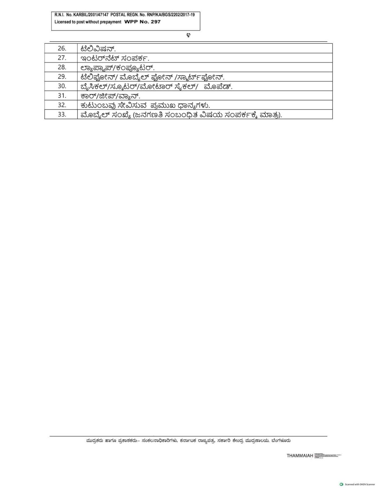 ಆಸ್ತಿ ಮತ್ತು ಸಾಧನಗಳು: ರೇಡಿಯೋ/ಟ್ರಾನ್ಸಿಸ್ಟರ್, ಟೆಲಿವಿಷನ್, ಇಂಟರ್ನೆಟ್ ಸೌಲಭ್ಯ, ಲ್ಯಾಪ್ಟಾಪ್/ಕಂಪ್ಯೂಟರ್, ಟೆಲಿಫೋನ್/ಮೊಬೈಲ್/ಸ್ಮಾರ್ಟ್ಫೋನ್ ಲಭ್ಯತೆ.