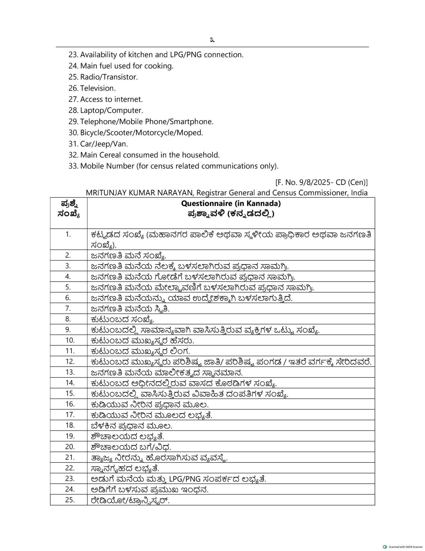 ಗಣತಿಯ ವೇಳೆ ಕೇಳಲಾಗುವ ಪ್ರಮುಖ 33 ಪ್ರಶ್ನೆಗಳು: