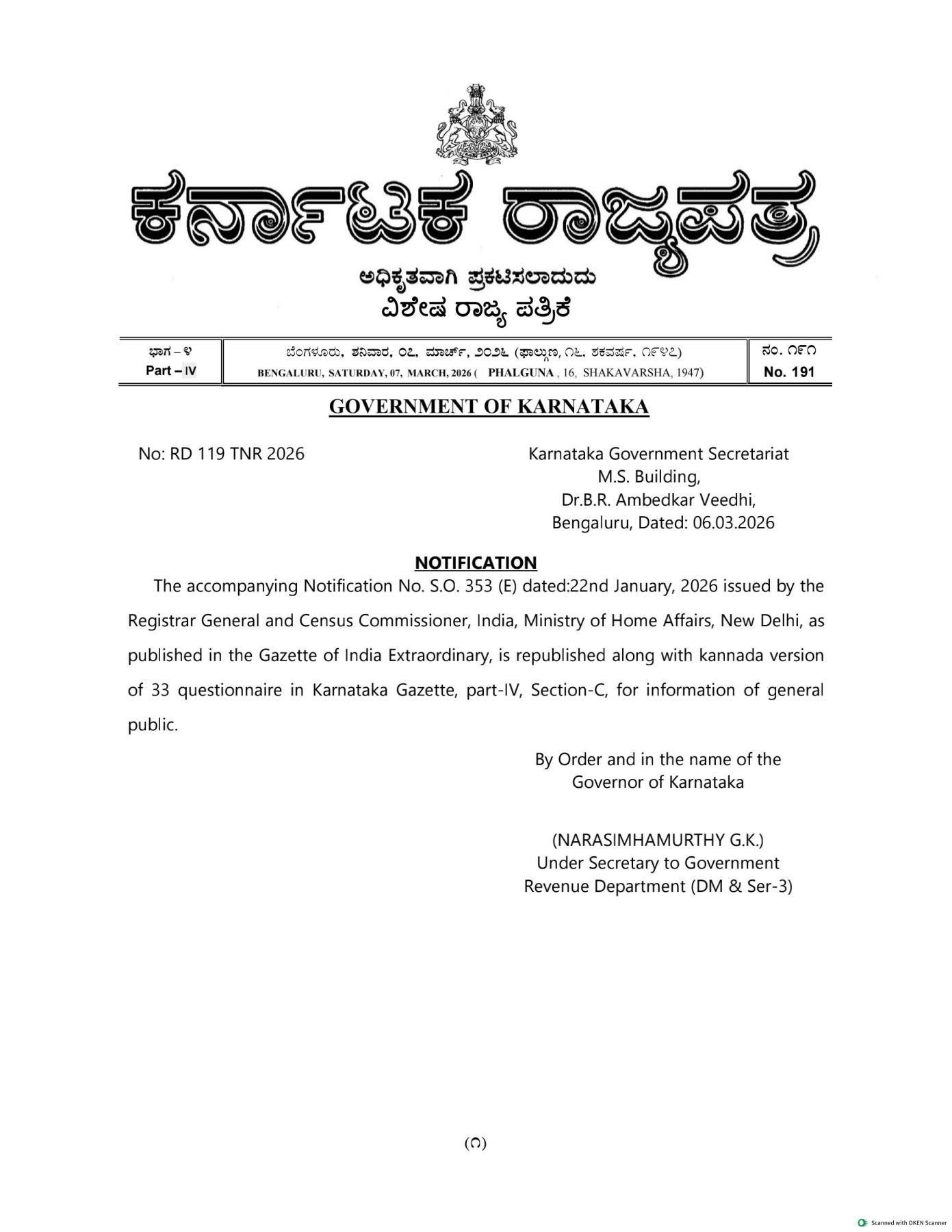 ಕೇಂದ್ರದ ರಿಜಿಸ್ಟ್ರಾರ್ ಜನರಲ್ ಮತ್ತು ಜನಗಣತಿ ಆಯುಕ್ತರು ಜನವರಿ 22, 2026 ರಂದು ಹೊರಡಿಸಿದ್ದ ಅಧಿಸೂಚನೆಗೆ ಪೂರಕವಾಗಿ, ಕರ್ನಾಟಕ ಸರ್ಕಾರದ ಕಂದಾಯ ಇಲಾಖೆಯ ಅಧೀನ ಕಾರ್ಯದರ್ಶಿ ನರಸಿಂಹಮೂರ್ತಿ ಜಿ.ಕೆ. ಅವರ ಆದೇಶದಂತೆ ಮಾರ್ಚ್ 6, 2026 ರಂದು ಈ ರಾಜ್ಯಪತ್ರವನ್ನು ಪ್ರಕಟಿಸಲಾಗಿದೆ.