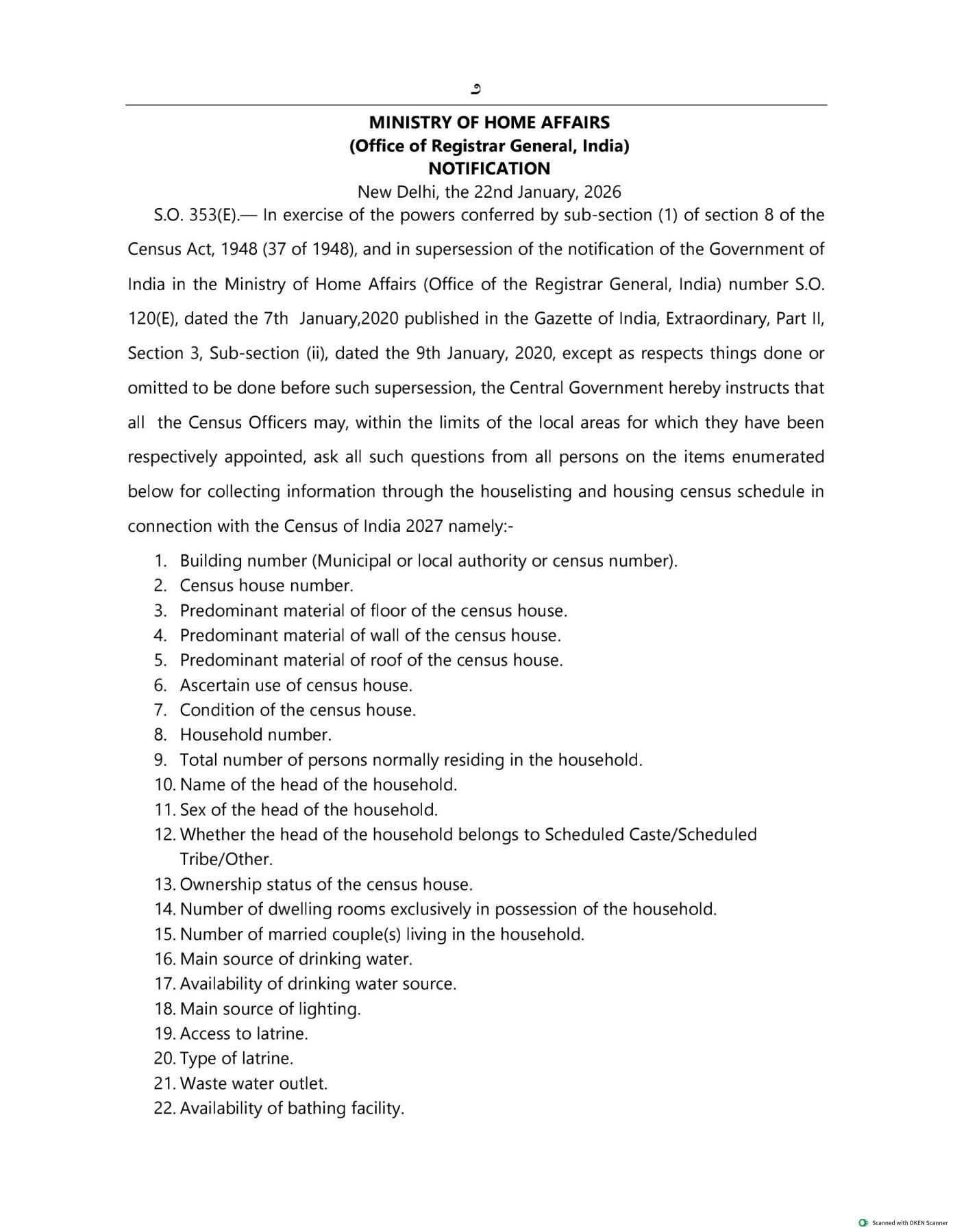 ಬೆಂಗಳೂರು: ಕೇಂದ್ರ ಗೃಹ ಸಚಿವಾಲಯದ ಸೂಚನೆಯಂತೆ 2027ರ ಭಾರತದ ಜನಗಣತಿಗಾಗಿ (Census of India 2027) ಸಿದ್ಧಪಡಿಸಲಾದ ಪ್ರಶ್ನಾವಳಿಗಳ ಅಧಿಕೃತ ಕನ್ನಡ ಆವೃತ್ತಿಯನ್ನು ಒಳಗೊಂಡ ‘ಕರ್ನಾಟಕ ರಾಜ್ಯಪತ್ರ’ದ ವಿಶೇಷ ಸಂಚಿಕೆಯನ್ನು ಹೊರಡಿಸಲಾಗಿದೆ. ಮನೆಗಳ ಪಟ್ಟಿ ಮತ್ತು ವಸತಿ ಗಣತಿಗಾಗಿ ಒಟ್ಟು 33 ಪ್ರಶ್ನೆಗಳನ್ನು ನಿಗದಿಪಡಿಸಲಾಗಿದ್ದು, ಸಾರ್ವಜನಿಕರ ಮಾಹಿತಿಗಾಗಿ ಇದನ್ನು ಪ್ರಕಟಿಸಲಾಗಿದೆ.