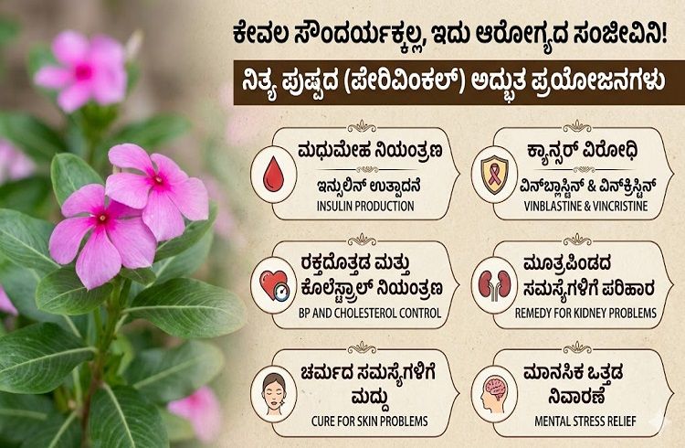 ನಮ್ಮ ಮನೆಗಳ ಮುಂದೆ ಅಥವಾ ಉದ್ಯಾನವನಗಳಲ್ಲಿ ಬಿಳಿ ಮತ್ತು ಗುಲಾಬಿ ಬಣ್ಣದಲ್ಲಿ ವರ್ಷಪೂರ್ತಿ ಕಣ್ಮನ ಸೆಳೆಯುವ ‘ನಿತ್ಯ ಪುಷ್ಪ’ (ಇದನ್ನು ಸದಾಪುಷ್ಪ ಅಥವಾ ನಿತ್ಯಕಲ್ಯಾಣಿ ಎಂದೂ ಕರೆಯುತ್ತಾರೆ) ಹೂವು ಕೇವಲ ಅಲಂಕಾರಿಕ ಸಸ್ಯವಲ್ಲ. ಆಯುರ್ವೇದದ ಪ್ರಕಾರ, ಈ ಹೂವು ಮತ್ತು ಅದರ ಎಲೆಗಳಲ್ಲಿ ಹತ್ತಾರು ರೋಗಗಳನ್ನು ಗುಣಪಡಿಸುವ ಅದ್ಭುತ ಔಷಧೀಯ ಗುಣಗಳಿವೆ.
