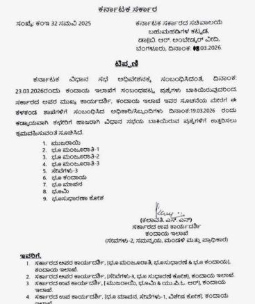 ಕಂದಾಯ ಇಲಾಖೆಯ ಸರ್ಕಾರದ ಅಪರ ಮುಖ್ಯ ಕಾರ್ಯದರ್ಶಿಗಳ ಸೂಚನೆಯಂತೆ ಕೆಳಕಂಡ ಶಾಖೆಗಳ ಅಧಿಕಾರಿಗಳು ಮತ್ತು ಸಿಬ್ಬಂದಿ 19.03.2026ರ ಇಂದು ಕಡ್ಡಾಯವಾಗಿ ಹಾಜರಿರಬೇಕು: