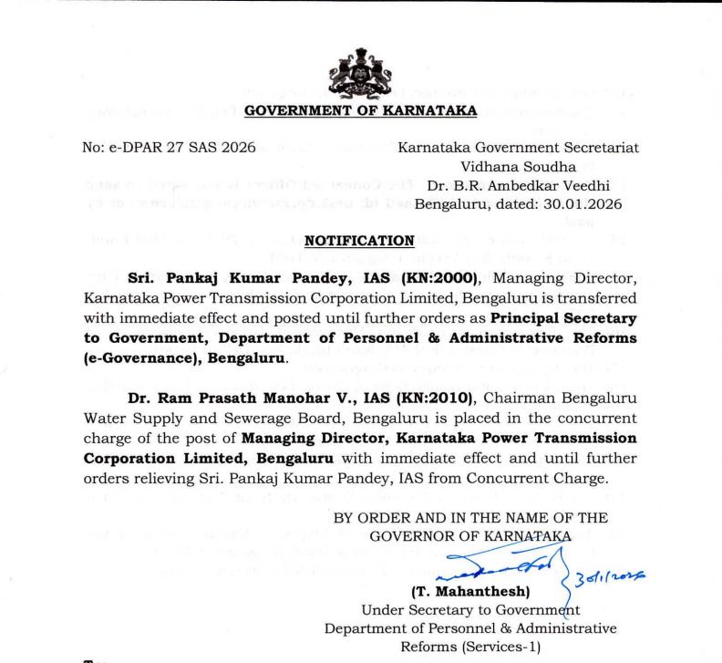 BREAKING: ರಾಜ್ಯ ಸರ್ಕಾರದಿಂದ KPCL ಎಂ.ಡಿ ಹುದ್ದೆಯಿಂದ ಪಂಕಜ್ ಕುಮಾರ್ ಪಾಂಡೆ ವರ್ಗಾವಣೆ