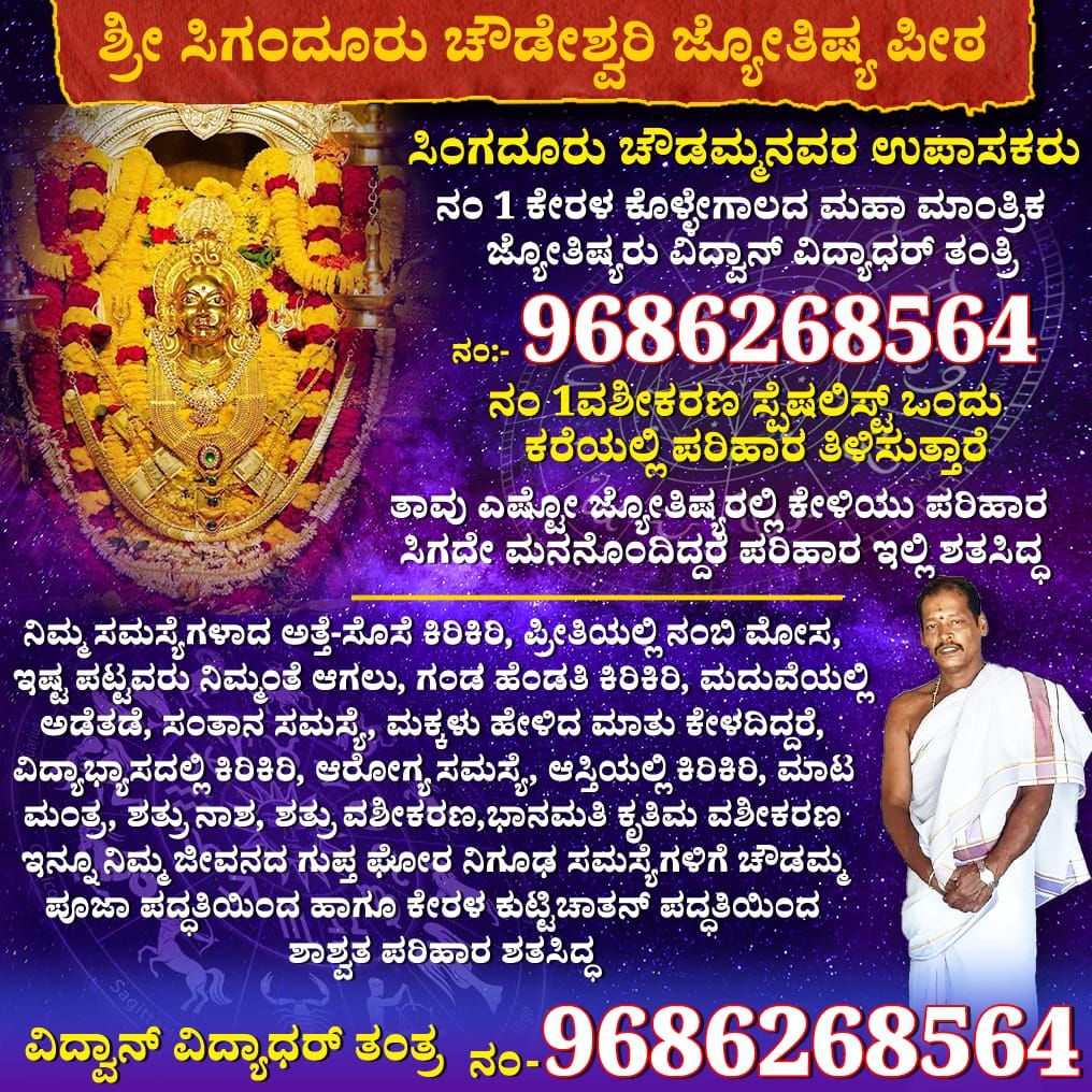 ನಂ 1ವಶೀಕರಣ ಸ್ಪೆಷಲಿಸ್ಟ್ ಒಂದು ಕರೆಯಲ್ಲಿ ಪರಿಹಾರ ತಿಳಿಸುತ್ತಾರೆ ತಾವು ಎಷ್ಟೋ ಜ್ಯೋತಿಷ್ಯರಲ್ಲಿ ಕೇಳಿಯು ಪರಿಹಾರ ಸಿಗದೇ ಮನನೊಂದಿದ್ದರೆ ಪರಿಹಾರ ನಿಮ್ಮ ಸಮಸ್ಯೆಗಳಾದ ಅತ್ತೆ-ಸೊಸೆ ಕಿರಿಕಿರಿ, ಪ್ರೀತಿಯಲ್ಲಿ ನಂಬಿ ಮೋಸ, ಇಷ್ಟ ಪಟ್ಟವರು ನಿಮ್ಮಂತೆ ಆಗಲು, ಗಂಡ ಹೆಂಡತಿ ಕಿರಿಕಿರಿ, ಮದುವೆಯಲ್ಲಿ ಅಡೆತಡೆ, ಸಂತಾನ ಸಮಸ್ಯೆ, ಮಕ್ಕಳು ಹೇಳಿದ ಮಾತು ಕೇಳದಿದ್ದರೆ, ವಿದ್ಯಾಭ್ಯಾಸದಲ್ಲಿ ಕಿರಿಕಿರಿ, ಆರೋಗ್ಯ ಸಮಸ್ಯೆ, ಆಸ್ತಿಯಲ್ಲಿ ಕಿರಿಕಿರಿ, ಮಾಟ ಮಂತ್ರ, ಶತ್ರು ನಾಶ, ಶತ್ರು ವಶೀಕರಣ,ಭಾನಮತಿ ಕೃತಿಮ ವಶೀಕರಣ ಇನ್ನೂ ನಿಮ್ಮ ಜೀವನದ ಗುಪ್ತ ಘೋರ ನಿಗೂಢ ಸಮಸ್ಯೆಗಳಿಗೆ ಚೌಡಮ್ಮ ಪೂಜಾ ಪದ್ಧತಿಯಿಂದ ಹಾಗೂ ಕೇರಳ ಕುಟ್ಟಿಚಾತನ್ ಪದ್ಧತಿಯಿಂದ ಶಾಶ್ವತ ಪರಿಹಾರ ಶತಸಿದ್ಧ ಜ್ಯೋತಿಷ್ಯರು ವಿದ್ವಾನ್ ವಿದ್ಯಾಧರ್ ತಂತ್ರಿ ನಂ:- 9686268564