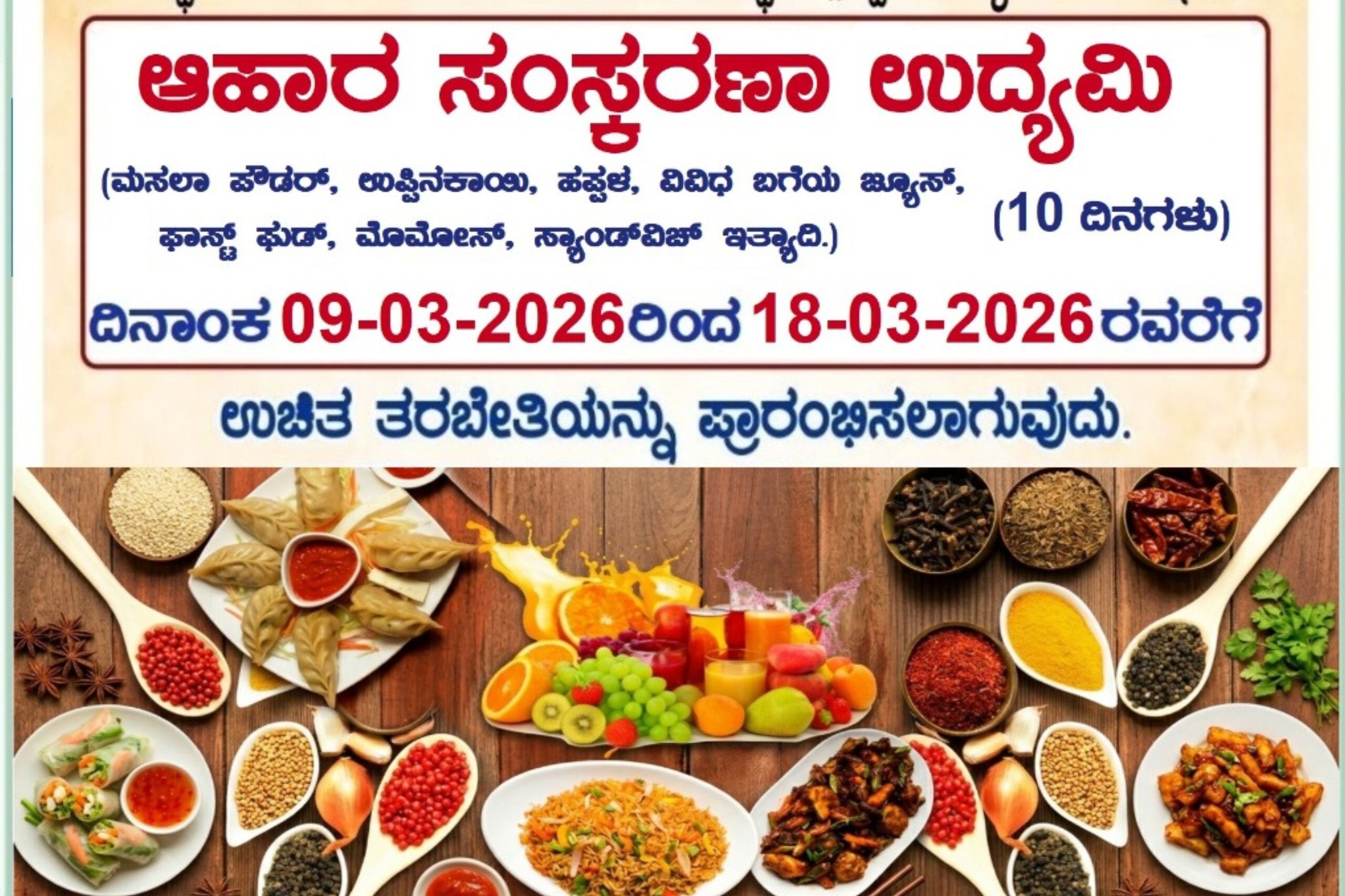 ಇಂದಿನ ಮಾರುಕಟ್ಟೆಯಲ್ಲಿ ಆಹಾರ ಸಂಸ್ಕರಣಾ ಉದ್ಯಮಕ್ಕೆ ಅಪಾರ ಬೇಡಿಕೆಯಿದೆ. ಈ ಹಿನ್ನೆಲೆಯಲ್ಲಿ ಅಭ್ಯರ್ಥಿಗಳನ್ನು ಯಶಸ್ವಿ ಉದ್ಯಮಿಗಳನ್ನಾಗಿ ರೂಪಿಸಲು ಈ ತರಬೇತಿಯನ್ನು ವಿನ್ಯಾಸಗೊಳಿಸಲಾಗಿದೆ.