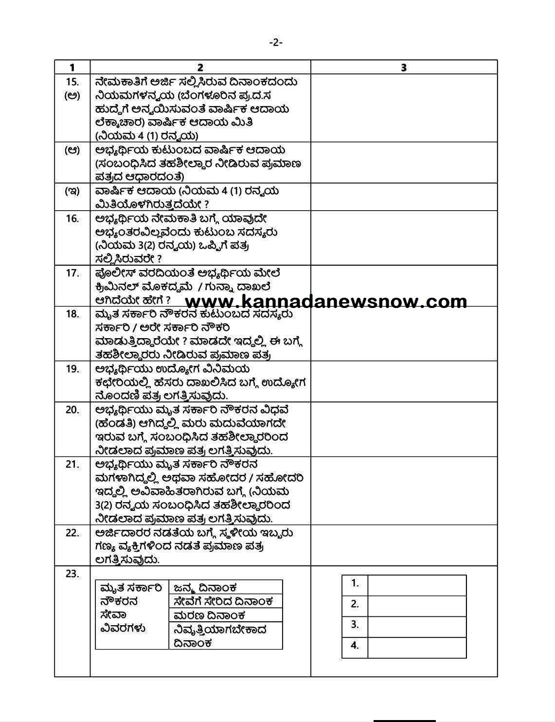 • ಅಭ್ಯರ್ಥಿಯು ಮೃತ ಸರ್ಕಾರಿ ನೌಕರನ ಮಗಳಾಗಿದ್ದಲ್ಲಿ ಅಥವಾ ಸಹೋದರ, ಸಹೋದರಿ ಇದ್ದಲ್ಲಿ ಅವಿವಾಹಿತರಾಗಿರುವ ಬಗ್ಗೆ ನಿಯಮ 3(2)ರ ಅನ್ವಯ ತಹಶೀಲ್ದಾರ್ ನೀಡುವ ಪ್ರಮಾಣ ಪತ್ರ