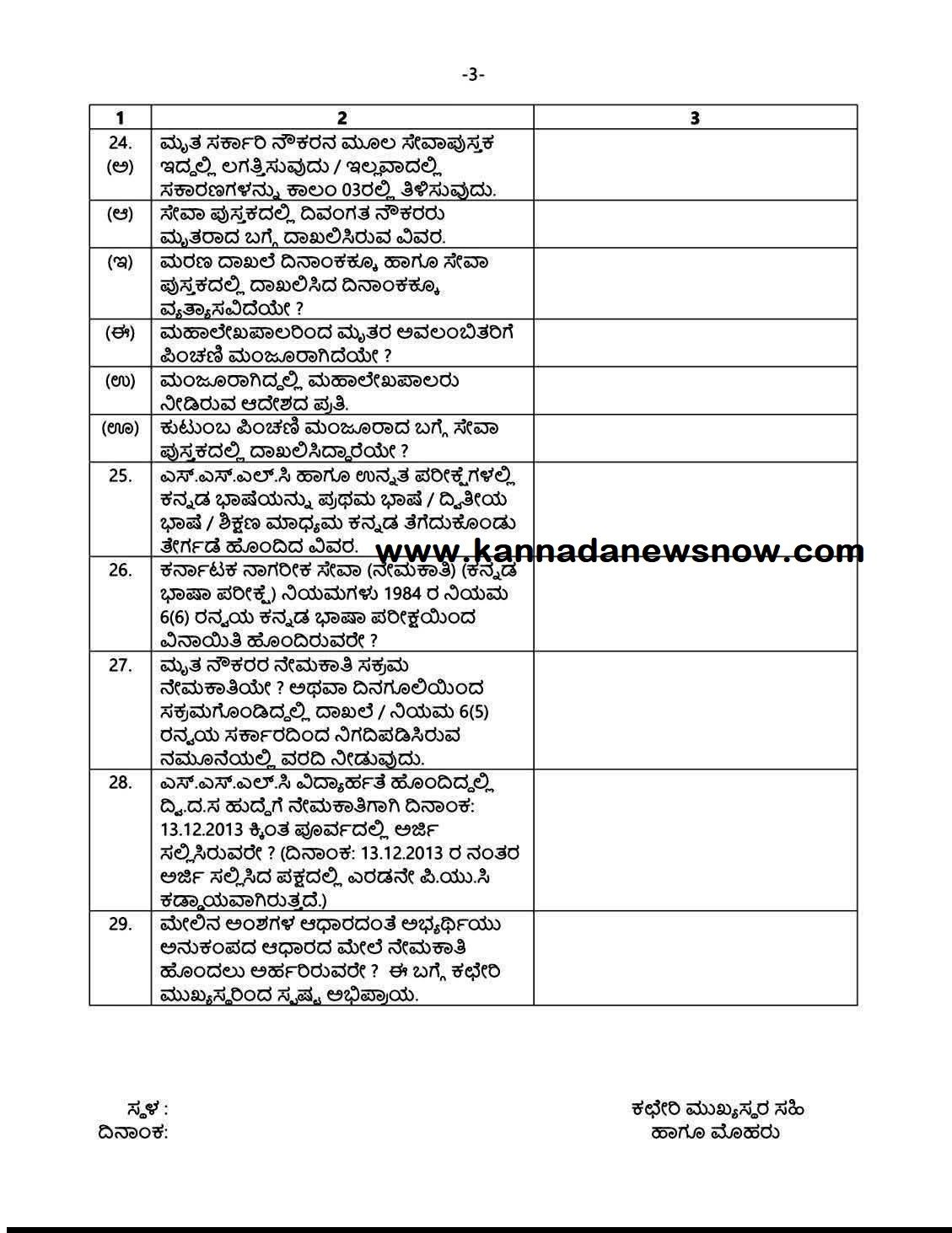 • ಮೃತ ಸರ್ಕಾರಿ ನೌಕರನ ಕುಟುಂಬದ ಸದಸ್ಯರು ಸರ್ಕಾರಿ, ಅರೆ ಸರ್ಕಾರಿ ನೌಕರಿ ಮಾಡುತ್ತಿದ್ದಾರೆಯೇ? ಎನ್ನುವ ಬಗ್ಗೆ ತಹಶೀಲ್ದಾರ್ ನೀಡುವ ಪ್ರಮಾಣ ಪತ್ರ